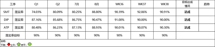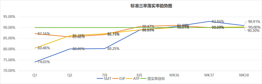 在標(biāo)準(zhǔn)三率落實(shí)率趨勢(shì)圖中,我們欣喜地看到,SMT/DIP/ATP終端團(tuán)隊(duì)以高度的責(zé)任感和使命感,認(rèn)真執(zhí)行三率標(biāo)準(zhǔn),積極地整改存在的問題,落實(shí)率在逐月提高,目前已全部達(dá)成目標(biāo)值。這些成績的取得,離不開每一位員工和領(lǐng)導(dǎo)層的辛勤付出和不懈努力。10月期望各車間向95%大關(guān)邁進(jìn)!