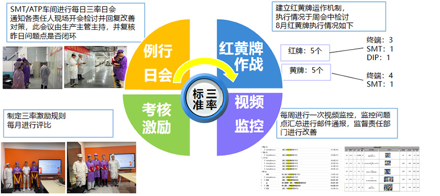 終端車間不僅有每日三率專員的二級(jí)稽查、還建立了各種維度的專項(xiàng)稽查如近期的文件排雷、紅黃牌作戰(zhàn)、視頻監(jiān)控等,并舉行三率例行日會(huì)和周會(huì)檢討發(fā)生的問題點(diǎn)并進(jìn)行整改。同步制定了三率激勵(lì)機(jī)制,以保證員工落實(shí)標(biāo)準(zhǔn)三率的積極性,保證工廠標(biāo)準(zhǔn)三率有效改善!