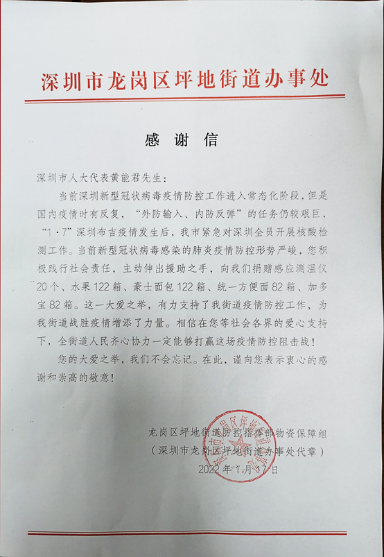 在“0107”新冠疫情發(fā)生以來,作為總部位于深圳市龍崗區(qū)的本土企業(yè),邁騰電子主動(dòng)踐行社會(huì)責(zé)任,深圳市人大代表,邁騰電子有限公司總經(jīng)理黃能君積極參與和支持深圳市疫情防控工作。1月17日,公司向位于深圳市龍崗區(qū)坪地街道坪西社區(qū)捐贈(zèng)生活物資與防疫物資,為社區(qū)疫情防控盡綿薄之力。